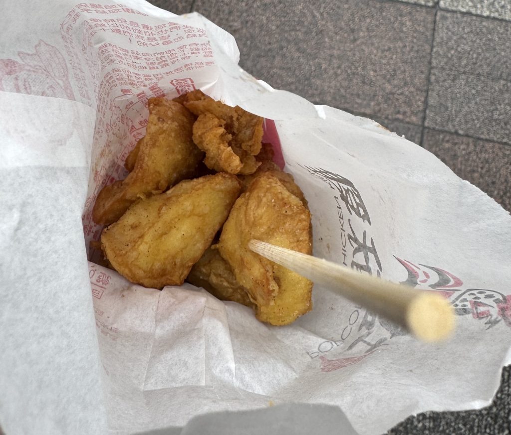 Next stops included Ximen Mango Shaved Ice where I grabbed some warm Soy Milk and a bready thing whose name escapes me (both of questionable veganity). I continued my rampage at Popcorn Chicken King Ximen 台灣鹽酥雞 西門直營店 where I ordered vegan fried chicken and fried oyster mushrooms.